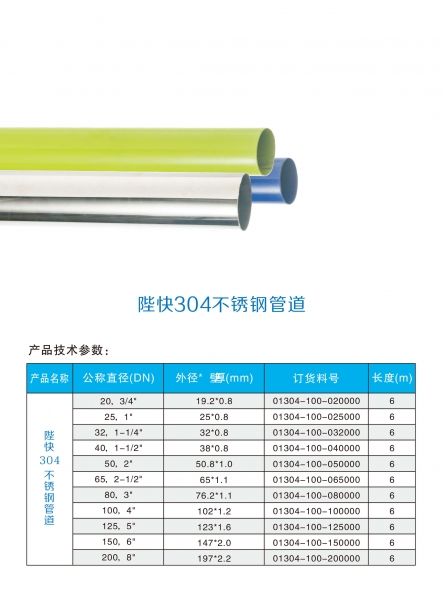 | 304不銹鋼快接管道 | DN20,3/4",19.2×0.7 mm,6米/根 | 01304-101-020000 | 304 |